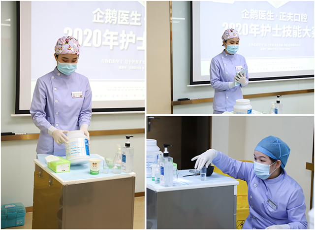 随后,企鹅医生·正夫口腔《2020年护士技能大赛之藻酸盐印模材料调拌技术》正式开始,本次竞赛由自我介绍、操作评比及理论回答三部分组成。