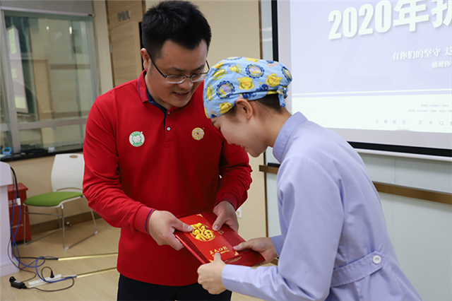 △图为医疗副总张运发为护理人员送上节日祝福