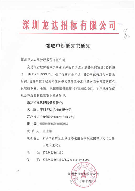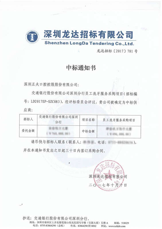 热烈祝贺正夫口腔中标交通银行股份有限公司深圳分行洗牙服务采购项目(招标编号LD2017EP-SZC083)。正夫口腔达凭借丰富的经验、雄厚的实力和良好的企业信誉,于2017年10月10日顺利中标——交通银行股份有限公司深圳分行洗牙服务采购项目。正夫口腔与交通银行股份有限公司深圳分公司的此次合作意义非凡,标志着随着正夫口腔的上市,越来越多的企业更信任正夫,认可正夫,更愿意与正夫达成合作。
